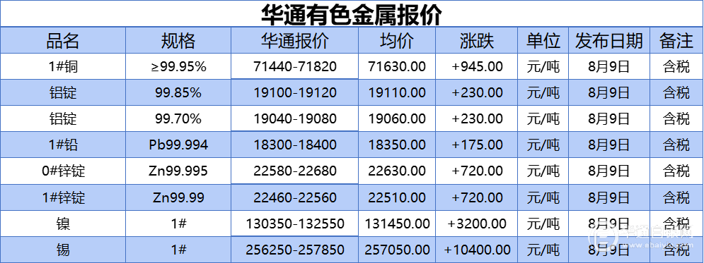 华通网8月9日讯:1#、铝锭(99.85%)、铝锭(99.70%)、1#铅、1#、0#锌、镍、锡报价