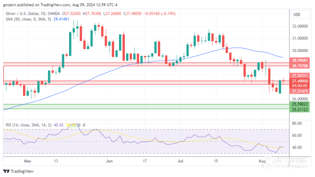 如果银价不能稳定在27.20-2.750美元阻力位上方,则将向最近的低点26.50美元附近移动。