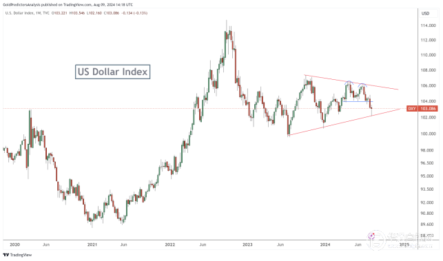 过去几周美元指数的疲软进一步加强了这一趋势,如下图所示,美元指数一直在三角形态内交易。美元指数总体上看空,正如看跌模式的发展所表明的那样。然而,美元指数必须跌破101才能维持下行势头。此外,美国国债收益率的下降进一步支撑了银价。