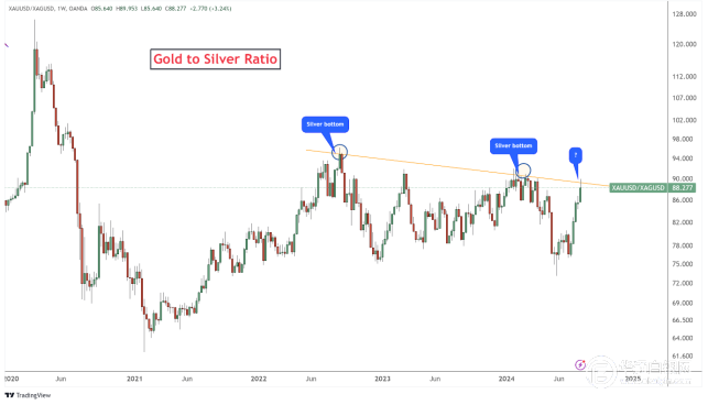 •金银比已达到关键阻力位,表明银价可能会出现反弹。