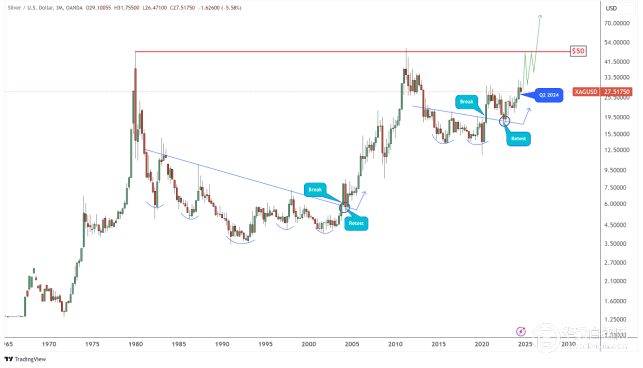 季度图表上的形态也显示,银价很可能突破50美元,并在未来几年开始强劲的价格飙升。