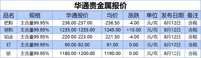 华通网8月12日讯:、、铂金、钌、铱报价