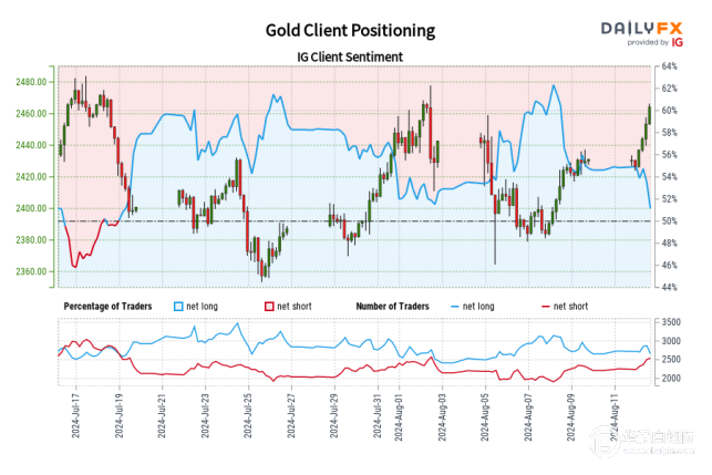 数据显示,自2024年7月19日以来,交易员首次净做空黄金,当时金价接近2,400.62美元。交易员比昨日和上周的净空头进一步增加,当前的情绪和最近的变化相结合,使我们对黄金看涨的反向交易偏向更加强烈。