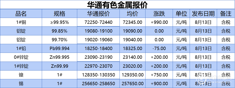 华通网8月13日讯:1#、铝锭(99.85%)、铝锭(99.70%)、1#铅、1#、0#锌、镍、锡报价