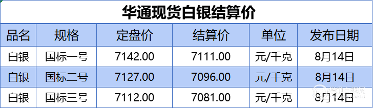 上海华通现货白银结算价:一号国标、二号国标、三号国标如下: