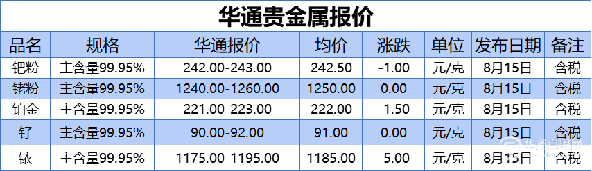 华通网8月15日讯:、、铂金、钌、铱报价