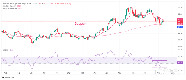 【华通网8月15日讯】•由于对美联储大幅降息的预期减弱,银价仍低于28.00美元。