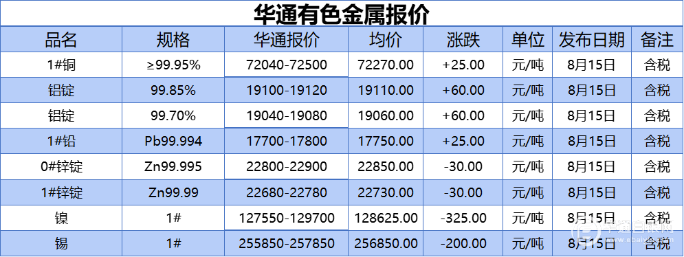 华通网8月15日讯:1#、铝锭(99.85%)、铝锭(99.70%)、1#铅、1#、0#锌、镍、锡报价