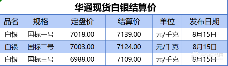 上海华通现货白银结算价:一号国标、二号国标、三号国标如下: