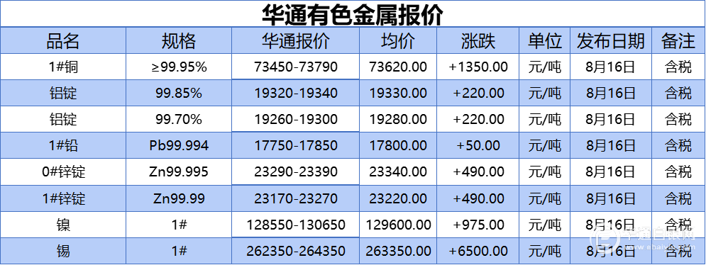 华通网8月16日讯:1#、铝锭(99.85%)、铝锭(99.70%)、1#铅、1#、0#锌、镍、锡报价