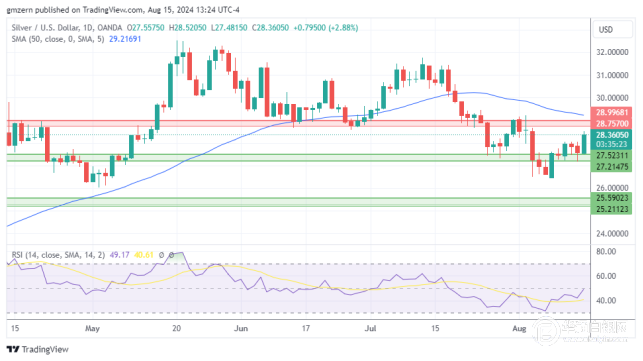 如果银价保持在28.00美元上方,则将测试最近的阻力位28.75-29.00美元。