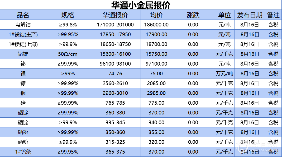 华通网8月16日讯:、1#镁锭(生产)、1#镁锭(上海)、锗锭、铋、锂、镓、铟、碲、硒锭(99.99%)、硒锭(99.9%)、硒粉、硒粉(99.9%)、1#钨条报价