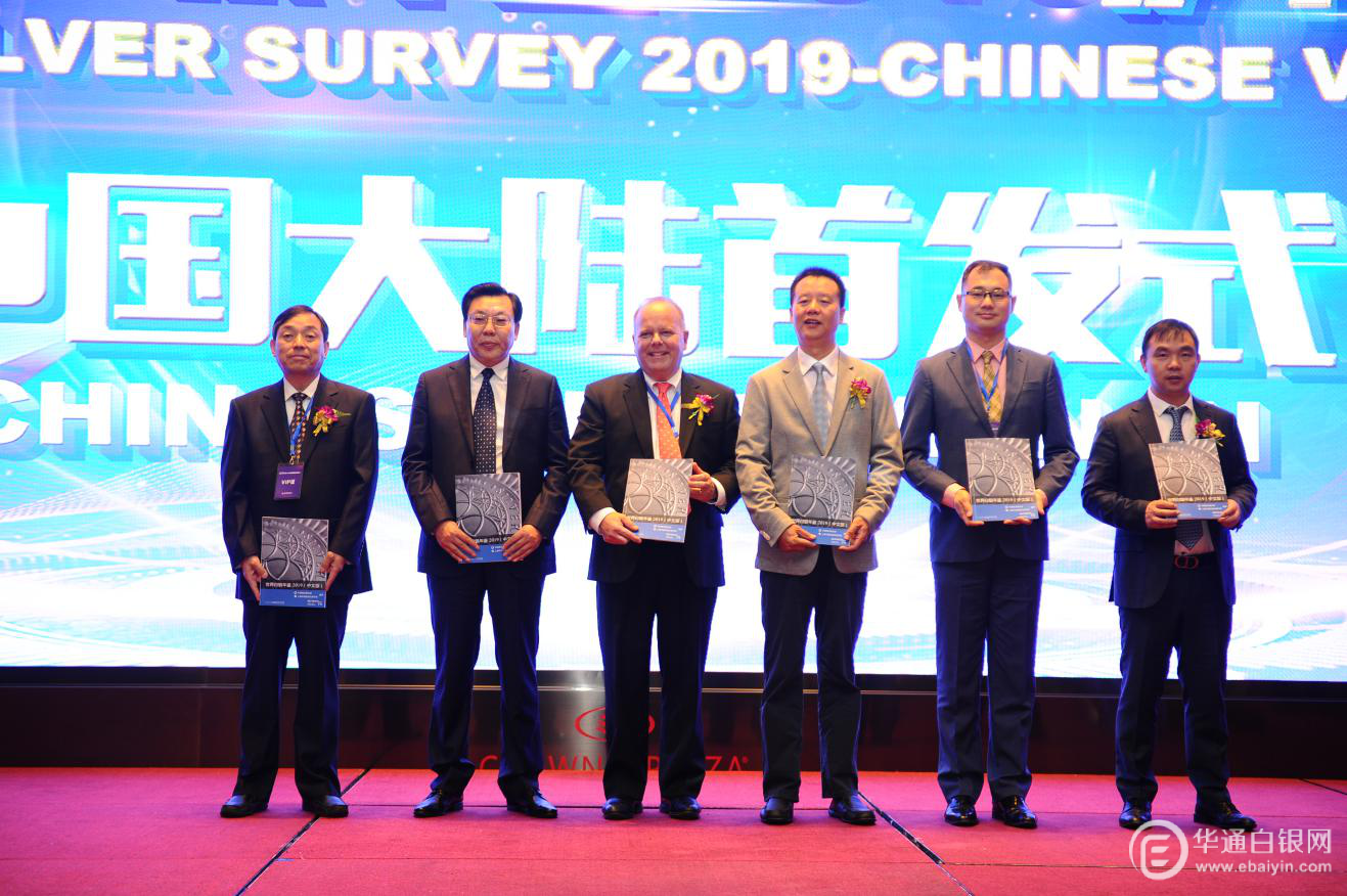 《世界白银年鉴2019》 (中文版)中国大陆首发式上,世界白银协会 执行董事 michael dirienzo上台为中国商业联合会常务副会长兼秘书长王民、中国有色金属工业协会副会长王健、中国五矿化工进出口商会副会长刘中慧、中国白银集团董事局主席陈万天等嘉宾赠年鉴合影。